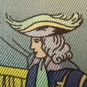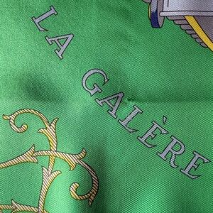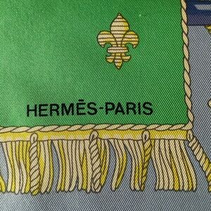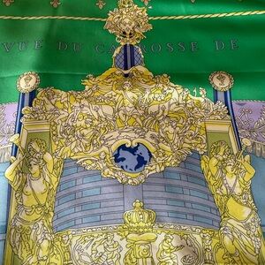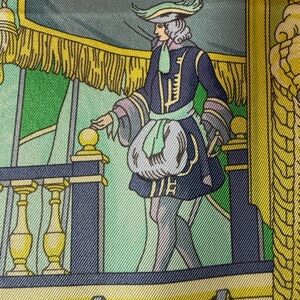 The HERMES Paris "Vue du Carrosse de la Galere la Reale" Green Blue Silk Scarf is a luxurious accessory designed for women who love the elegance of Paris. Made of high-quality 100% silk satin fabric in France, this bandana/square, 90cm / 34” square scarf features a stunning multicolor design with a Parisian theme. Perfect for adding a touch of sophistication to any outfit, this HERMÈS scarf is a timeless piece that will elevate your style with its fine craftsmanship and classic design.