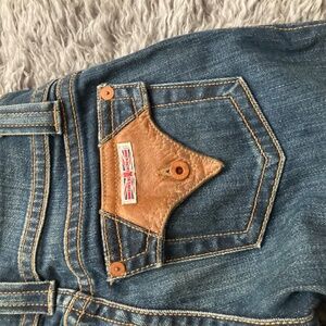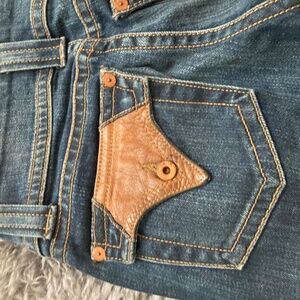 Rare Vintage Hudson Signature boot cut Low rise form fitting Jeans with real leather pocket detail.