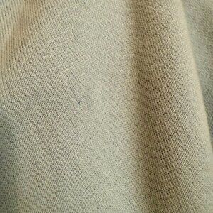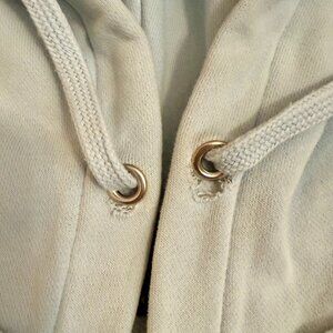 Overall, the sweatshirt is in good condition. However, it does have some minor flaws, as seen in the last four images. There are faint yellow stains inside the hoodie on the rim. There is one faint stain or discoloration on the outside of the hood, and the grommets have come loose. These flaws are barely visible due to their locations.