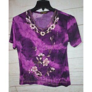Rare Vintage Kai Hao XXL Purple Floral Glitter Foil Short Sleeve Women Shirt