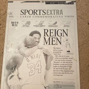 Celebrate the legendary victory of the Los Angeles Lakers with this vintage LA Times printing plate, featuring the iconic "Reign Men" headline from June 13, 2002. This commemorative plate captures the triumphant moment when Shaquille O'Neal and Kobe Bryant celebrated their NBA championship victory, solidifying their place in basketball history.