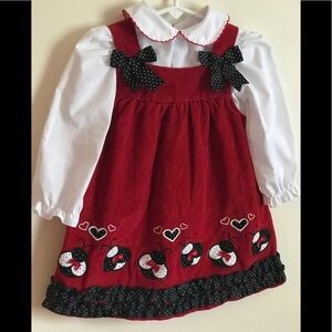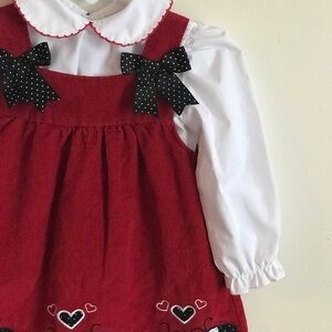 Gorgeous Rare Vintage 80’s Custom Ladybug Appliqué Red Corduroy Dress.Black Ruffle Bow Swiss lace and hearts design.Custom Peter Pan Collar red trim matching blouse.Excellent Vintage condition for its time.A real Vintage heartbreaker .17 inches long.