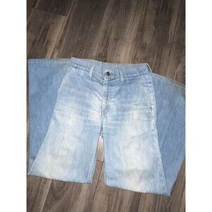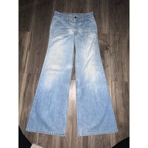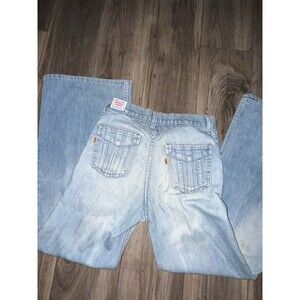 The product is a rare vintage pair of Levi's DOUBLE Orange Tab BOOTCUT Jeans in size 4. These jeans are designed for women with a regular size fit and a light fabric wash. The bootcut style adds a flattering and stylish touch to the classic blue color, while the high rise and accent details like the button, zipper, and logo give them a unique and vintage appeal. Perfect for those looking for a one-of-a-kind addition to their wardrobe with a touch of retro charm.