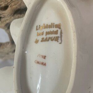Rare vintage Lightolier trinket dish hand-painted by Zapun, crafted from fine china in the shape of an acorn leaf. The dish is green, gold, and rust-colored, with a white underside. Marked "Lightolier Hand Painted by Zapun Fine China." Please see photos for more details.