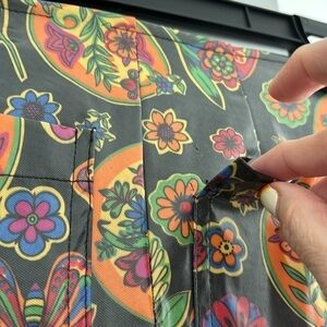 Bright groovy butterflies and floral print. I don’t know for sure, but these may look really cool under a black light. There’s even a little pocket inside by their waist to put who knows what