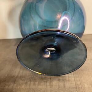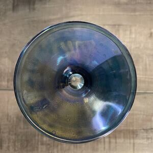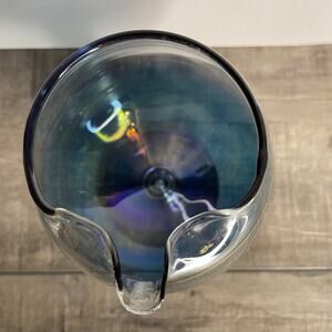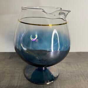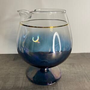 Vintage Blendo Blue Iridescent Brandy Snifter Pitcher With Gold Trim. This is a hard to find color way in an iridescent peacock blue. Measures 5.5 inches high.