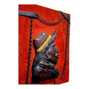 This is a rarety. Classic Mid Century wood carving on red velvet with leather and chain details in size 1” x 11.5” x 15.5”