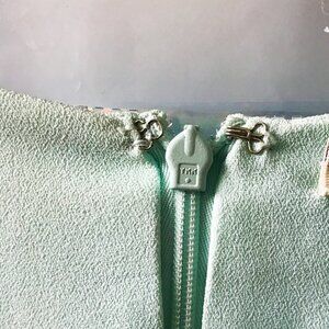 This is a beautiful light, mint green 60's inspired cocktail dress that still has the inventory tag still on it. It has not worn by anyone but soon by YOU. No one will be wearing this or anything like this dress. Knee length. Slits on the side to give you more movement without damaging the beading. It has padded shoulders. A rare find.