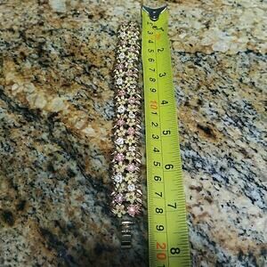 Rare Vintage Monet Signed Pink Yellow Enamel Flower Bracelet Gold Tn Rhinestones