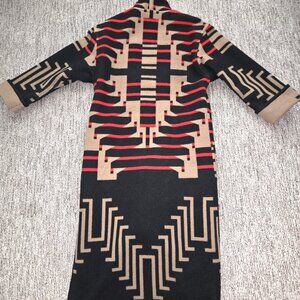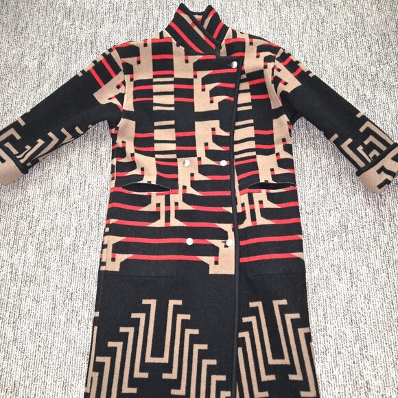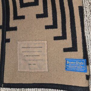 RARE! PENDLETON POTLATCH ROBE BLANKET COAT, A TIME OF GATHERING 1989 BEAVER STATE WOOL Pendleton Beaver State "Potlatch Robe" reversible Native American inspired blanket with a suede patch reading "Salmon Gills and Quail Feathers, A Time Of Gathering, In Honor of Washington Centennial 1889-1989".The used, but in very condition, wool blanket coat is tan and black with accents in red. It is reversible with one side black with red and tan design, and the other side being tan with red and black design. The black side has a high neck while the tan side has an open collar neck. The buttons are silver Indian heads. It has patch pockets on the tan side while the black side has slit pockets. This reversible coat has two different looks both are chic. The blanket was purchased at The Rainbow Man in 1993 in Santa Fe and the coat was handmade by an artist. This is a rare Pendleton and highly collectable and is a show stopper. The coat is warm and a classic and is one size fits all. It measures 48" in length from the shoulder to hem, the sleeves measure 25" from the drop shoulder when un cuffed. This coat is vintage from 1993. There are 2 tiny moth damaged areas, see pictures. The hem is frayed in one area, see pictures. All in all it's in very good condition.