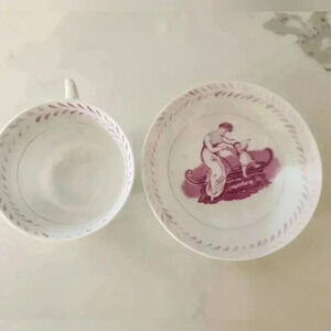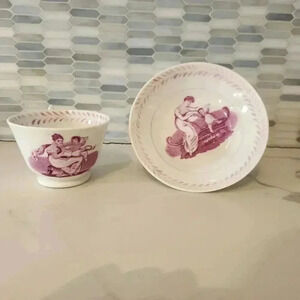 RARE Regency Porcelain Bowl & Cup by Miles Mason with Adam Buck Bat Print Images of Mother and Child in Soft Red circa 1810 (yes, ~ 200 years old!)
