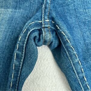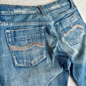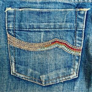 Joe’s Jeans 1971 Collection Vintage Denim. Size 29. Made in USA. Features embroidered back pockets, subtle flare leg, mid-rise, classic fit. Unique distressing reveals the Joe’s logo on the back pocket, subtle retro vibe with a boho western touch. Soft, medium wash premium denim with a naturally worn-in feel, ideal for Y2K and festival looks. Collectible and rare 1971 line. Pairs well with western-style pieces for a true retro vibe.