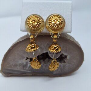 These rare vintage Robert Rose designer gold-tone clip-on earrings are a unique and stylish addition to any jewelry collection. The earrings feature a classic dangle/drop style, with a round clear acrylic main bead set in a gold-tone metal setting. The clip-on closure makes them easy to wear, and the vintage design adds a touch of nostalgia to any outfit. These earrings are signed by the designer and are 2 1/2" in length, making them a striking statement piece for any occasion.