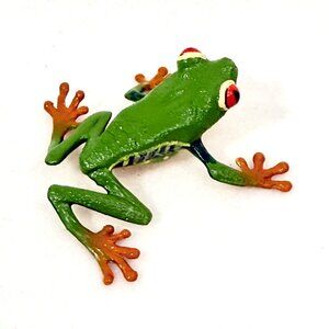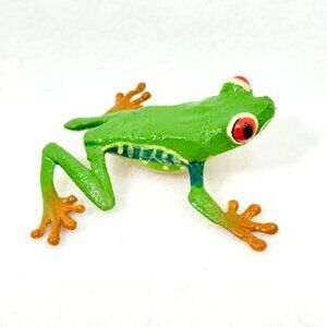 This hand-painted 1994 Safari Ltd plastic figure showcases a vibrant red-eyed tree frog design. Made of sturdy plastic, it’s a rare collectible for enthusiasts. Overall good vintage condition. Some minor wear of painted accent lines. The size of the frog is approx. 2.75" x 2.75"