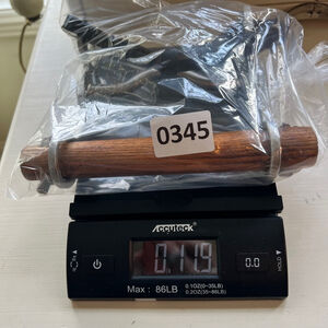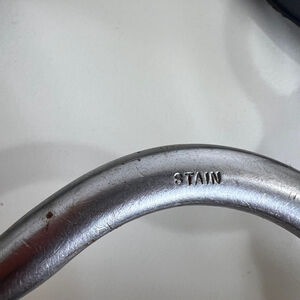 Vintage handmade Pre-owned toilet paper holder crafted from repurposed metal horse bit and leather. The metal shows signs of wear, including minor scratches and discoloration. The wooden dowel is dark brown, possibly stained, with some minor imperfections. Dimensions are approximately 8 inches in height and 6 inches in width. The holder is functional, and in fantastic vintage condition. The brand and model are unknown. The metal bit is stamped with "STAIN".