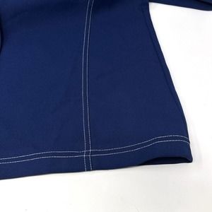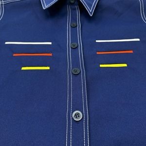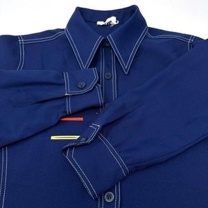 Vintage 70's button-down long sleeve shirt jacket with with a large pointed collar. Fabric feels like polyester. Shirt is navy blue with white double stitch contrast stitching. The buttons are navy blue and circular. There are a total of 6 slit pockets on the left and right chest, 3 on each side. The top pocket has white outline and is the longest at 4" wide. The middle has a red outline and is 3" wide. The bottom has a yellow outline and is 2" wide.