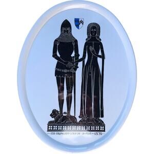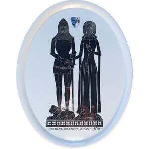 Vintage melamine serving plate depicting Sir John De La Pole and his wife, Lady Joan De La Pole. The image is taken from a brass rubbing of the couple created circa 1370. The image is unusual because the couple hold hands rather than clasp them separately in prayer.