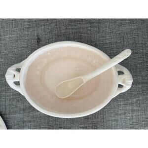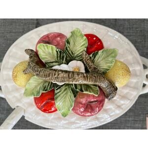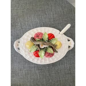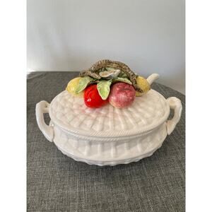 Vintage Ceramic Soup Tureen with fruit and flower embellishments on top. Comes with ladle. 11x8 inches. Small chip on side seen in photo. No other flaws.