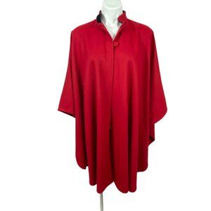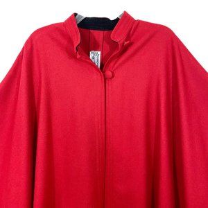 Rare Texas Body Hangings red wool cape. Two button closure at top. Very good overall condition, however, there are about 6 small moth nibbles/holes on the back (see last photo). The largest nibble is pictured, and it's approx. 1/8" long. They are pretty tiny and could easily be stitched/repaired with matching thread. I did not see any holes in the front. There is an extra button near the inside front opening. Size is medium. Length is approx. 39.5" from shoulder.