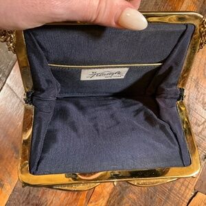 Rare Vintage Triangle New York Navy Leather Clutch Crossbody Evening Bag Gold Frame Chain Strap