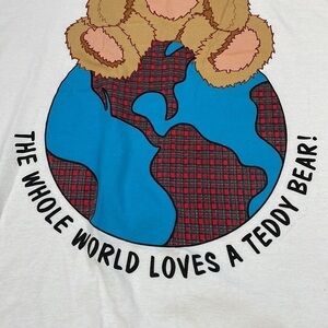 Large teddy bear on planet graphic “The Whole World Loves A Teddy Bear!”