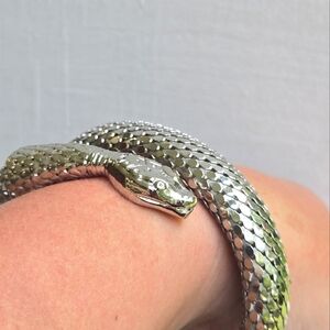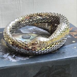 rare vintage serpent bangle, Whiting & Davis silver mesh snake, gothic revival arm cuff, whimsigoth coiled bracelet, dark feminine glam, Y2K fantasycore jewelry, romantic occult accessory, coiled snake goddess vibes, maximalist vintage mystic, dark academia jewelry, vampy silver serpent wrap, antique-inspired statement piece, soft grunge edge, slinky serpentcore bracelet, dramatic witchy luxe