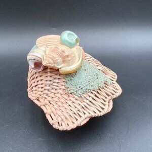 This rare vintage wicker clam shell storage basket is a must-have for any nautical-themed collection. The medium-sized basket measures 5 inches in length and 4 1/8 inches in height, making it perfect for any room in your home. The multicolor design features beautiful seashells that add a touch of elegance to the basket. Crafted from high-quality wicker material, this storage basket is both durable and lightweight, weighing only 3 1/2 ounces. The basket also comes with a unique nautical style, making it a great addition to any decorative collectibles collection. Manufactured in the 1990s, this item is a true gem that will add value to any collection.