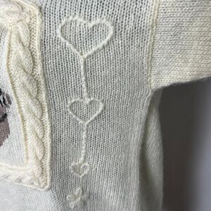 The center panel displays a delightful scene of three kittens playing in a basket with balls of yarn. The sweater is further embellished with delicate hearts, flowers, and cable knit accents down the sleeves. This piece perfectly captures the cozy, cottagecore, and unique vintage aesthetic.