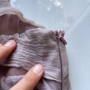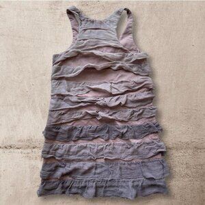 Description: rare vintage y2k shift mini dress in shades of taupe, dusty rose, and gray, with gauzy horizontal strips of fabric detail by Amy Fink in US women’s size 6 (seems to run small: please refer to measurements below).