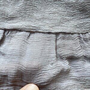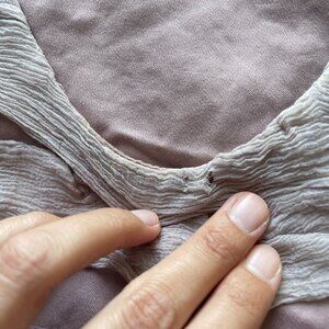 Condition: fair condition. Visible wear throughout. Dinginess in the colors of the different fabrics. Several holes in the gauzy fabric of the dress. Though honestly, it gives the dress a very grunge feel, and the lining is still in very nice shape.