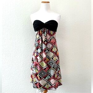 Description: the gorgeous print on this silk strapless mini dress is so fun! Almost one-of-a-kind find! Vibrant colors with black ruched bust that extends to the back with a long tied bow