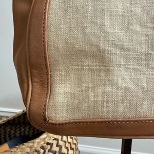 Rare vintage Coach 9429 Bonnie bucket, linen and tan leather double strap top handle shoulder bag or small tote. Hang tag included. Flap snap tab closure and the inside of the bag and dark brown fabric lining with one interior zipper pocket. The bag measures approximately 11” x 10” and approximately 3 inches deep. 11 inch strap drop. Y2K. No breakthrough on the corners or piping.