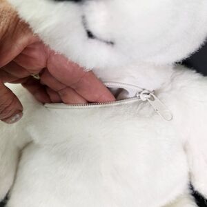please see the pictures. There is one small stain in the right arm. Recently clean and sanitized and ready to be played with.