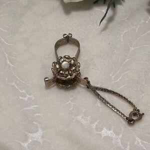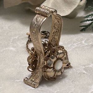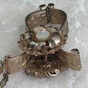 40s–50s gold-tone accessory, designed to secure gloves, scarves, or purses with elegance. Measuring 3 1/4"long by 1 1/2" wide, it features a MOP center inset within a flower-shaped hinge with floral engravings. The clips open and close when pinched together. Unsigned, but registers as glass on the Presidium and boasts a delicate flat chain.