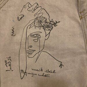 Super unique and hard to find! These light gray denim jeans feature expressive line-art faces and handwritten-style graphics throughout — artsy, modern, and effortlessly cool. Straight-leg silhouette with classic 5-pocket styling.
