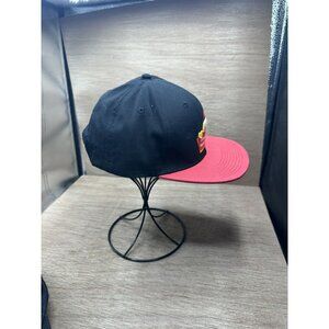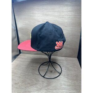 This rare Wienerschnitzel trucker hat features a snap-back closure and an adjustable size. The red hat is styled as a 5 panel design with a 90s theme, perfect for men. It is embellished with the Wienerschnitzel character logo and is breathable for added comfort. Made in China.
