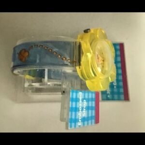 This beautiful retired out of production Winnie the Pooh watch is one that is hard to find. Done in a durable silicone, it features a yellow flower design bezel with a small dangling flower charm. The face depicts Winnie the Pooh and the blue Embossed strap has a flying honeybee design.