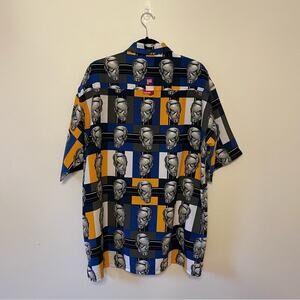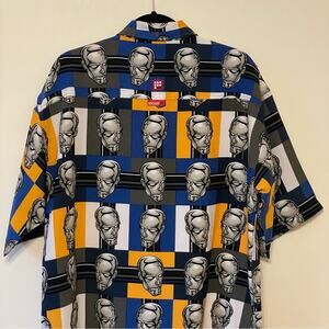 Details: Y2K Ecko Unltd. Large short sleeve t-shirt button down casual pop art Silver Surfer from Marvel comic book character collared neckline stripe geometric streetwear urban
