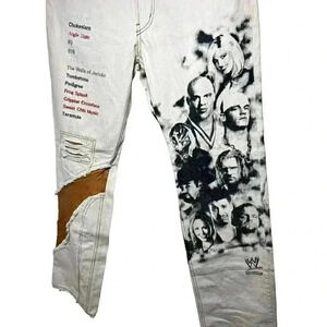 Perfect for WWE collectors, Y2K fashion lovers, or anyone who appreciates bold statement pieces. These jeans are incredibly rare and hard to find, making them a valuable addition to any vintage wardrobe.