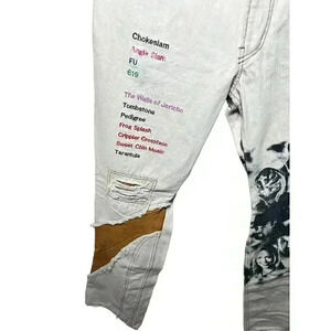 • Details: Frayed hem, distressed knee patch, and signature wrestling move text design