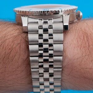 The 40mm Super Sea Wolf Compression pays homage to the power of the ocean and our ongoing love a air with exploring the unknown. Inspired by waves breaking at the shore, the salty sea breeze, and the wonder that fi lls us when contemplating the vastness of the ocean, our latest iteration of the iconic Super Sea Wolf features a bright white bezel with ocean blue markers and dial accents, and is an instant nod to a summer by the sea. Complemented by a brushed fi ve-link stainless steel butterfl y-clasp bracelet, this limited run timepiece holds a Swiss-made STP 1-11 automatic movement.
