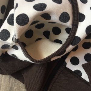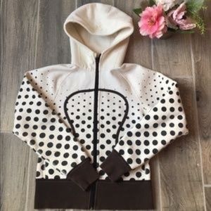 Adorable LULULEMON Athletica Scuba Hoodie, Cream background and Brown Polka Dots with Zipper Up Closure and Two Front Pockets. No size info tag. Pre-Owned and well loved, too small for me now and even though is a collectible piece I am willing to part with it so someone can enjoy and flaunt it!