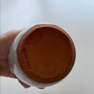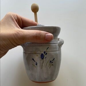 Description: rare and unique Owens pottery, handmade ceramic honey pot with wooden stirrer. Has local advertisement etched on the back.