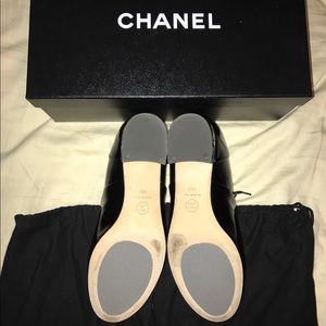 Adorable and stylish patent chanel flats with camellia details on heel.