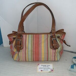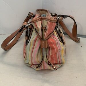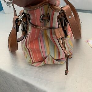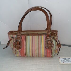 Classic 1954 fossil canvas and leather bag just gorgeous has silver tone, hardware, leather, trim canvas body inside has a zip closure pocket and large zipper section 2 slip pockets., key tag traditional on a fossil bag bottom very colorful and spring, has tightening leather straps on either side to bring the size in or out