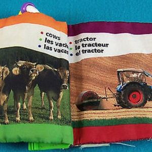 Rare BABY EINSTEIN infant baby boy, girl teether ring book, it is for a baby 3 months and older. It has pictures of different things on a farm, it spells the item in three different languages. It has three rubber rings, 2 rubber bar-like and the book makes a crackling sound when it is played with. It is 5"X7" in size not including rings. It is made of polyester-like material and rubber material. It will be perfect for your little prince