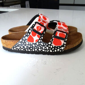 Limited edition Rare Birkenstocks two strap and buckled sandal size 36 Arizona two tone dots it they are in great used condition no major flaws slight tiniest crack normal use souls are good bottoms are good not easy to come by or find these see photos for extra description red black white