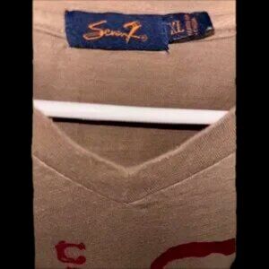 Seven 7 super cool Vee neck NEW vintage flawless slightly perfectly distressed and in an xl menβs TTS can certainly be unisex ! Golden mauve color with print on front and left sleeve - red distressed seven brand printing - super comfy and brand new. Rare ! Happy
