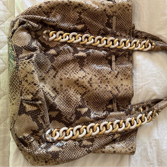 This mIcheal Kors bag is beautiful, heavy as it is quality. Pockets on the inside and 2 marks at bottom of inside. The handles have wear but not noticeable.. she is a show stopper and needs a new home to showcase her!!