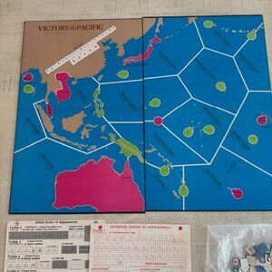 Classic, naval simulation game from Avalon Hill. Game is in very good condition and is 100% complete to include all counters and movement cards. See photos for details. Victory in the Pacific is a board game produced by Avalon Hill in 1977. The game is a simulation of the naval and air campaigns fought between the United States and Japan in the Pacific Theater of World War II.